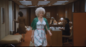 Dolly Parton as Doralee, a secretary in a white dress with blue and red stripes.