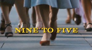 Low angle shot of professional men and women’s feet walking, with title card “Nine to Five” over it.