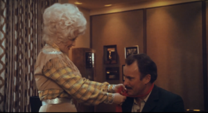 Fantasy sequence: Doralee dressed in yellow cowboy garb ties a red tie around Hart’s neck.
